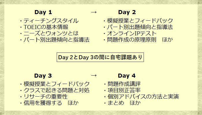 TTTは4日間の講座です。(自宅課題もあり) *Day 4は月曜です。ご注意ください。