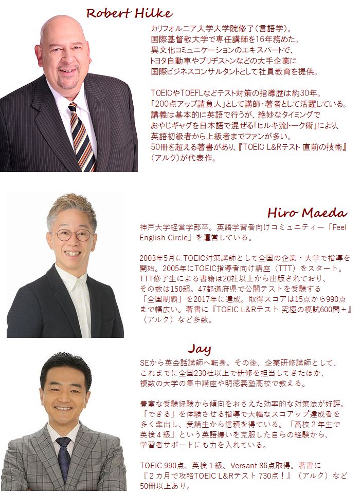 ロバート・ヒルキより The TTT is something that I always circle in bold on my calendar. And this year marks another exciting version of this valuable and enjoyable event! Whether you are currently teaching TOEIC, considering doing so, or just have a strong interest in English, TTT will give you the chance to learn practical techniques and skills, not only from Hiro, Jay, and me, but also from your fellow TTT members. I look forward to welcoming you into our TTT family of more than 400 members starting in February.